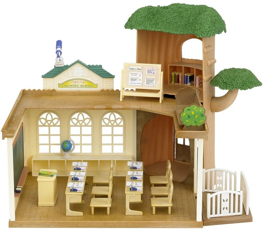 The Country Tree School is such a fun school! Whilst there is a classroom which comes furnished for lessons for up to 6 Sylvanian children, complete with 6 seats and desks, the teacher's desk and whiteboard, there is also a tree to climb in break time! A balcony overlooking the beautiful Sylvanian scenery provides the perfect platform for pupils to get inspired for their art lessons or spot some wildlife. For any little star-gazers, there is a telescope fitted to the roof which can also be connected to the tree for a better view. Finally, there is also a bench for your little Sylvanians to relax after many hours practising their sums and ABCs.