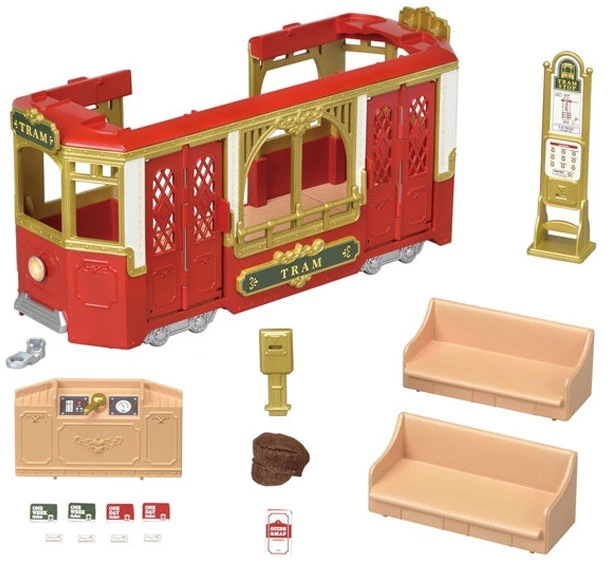 The set includes tram, sign x2, joint, ticket machine, tram stop, cab, seat x2, driver's hat, ticket x8, map (total 19 pieces).